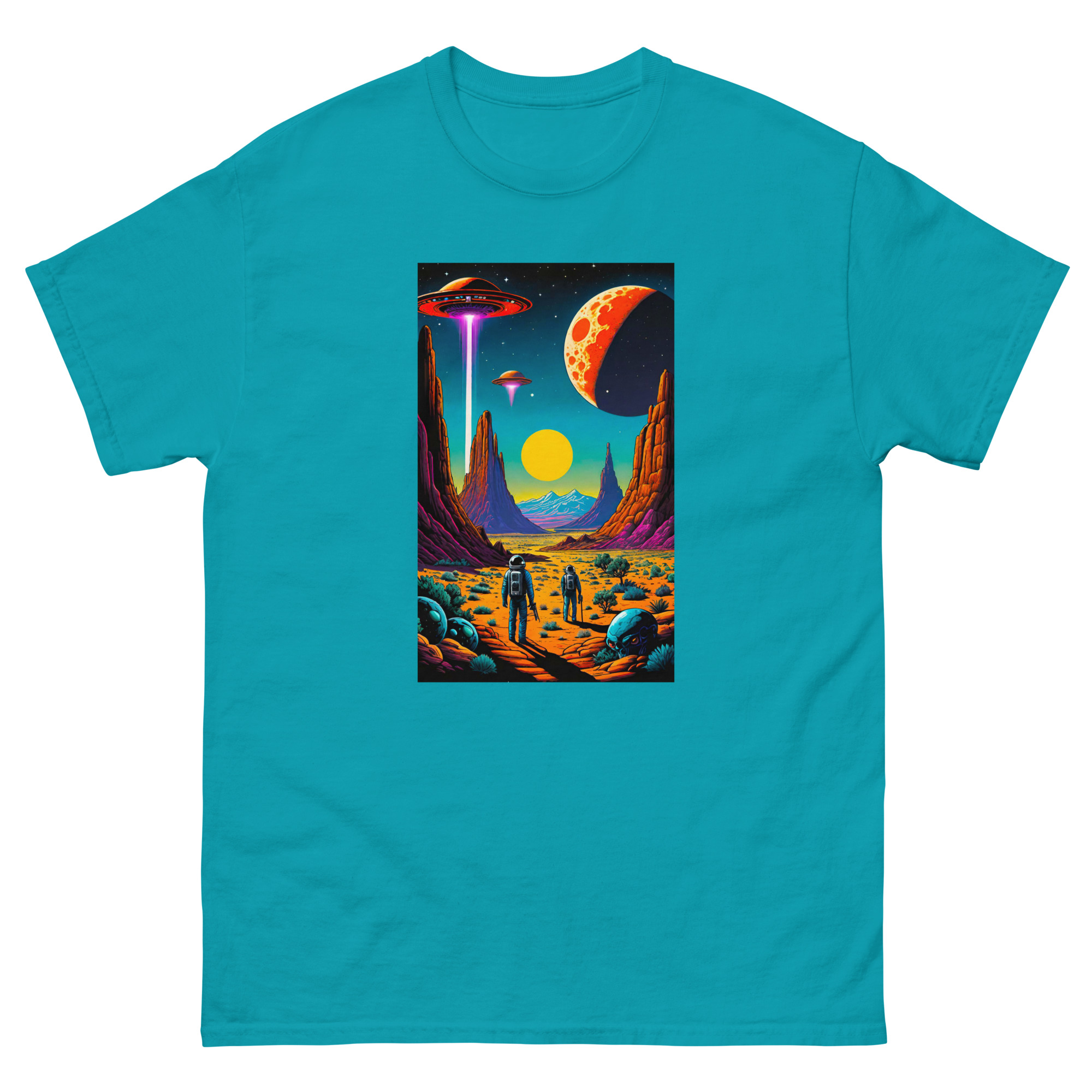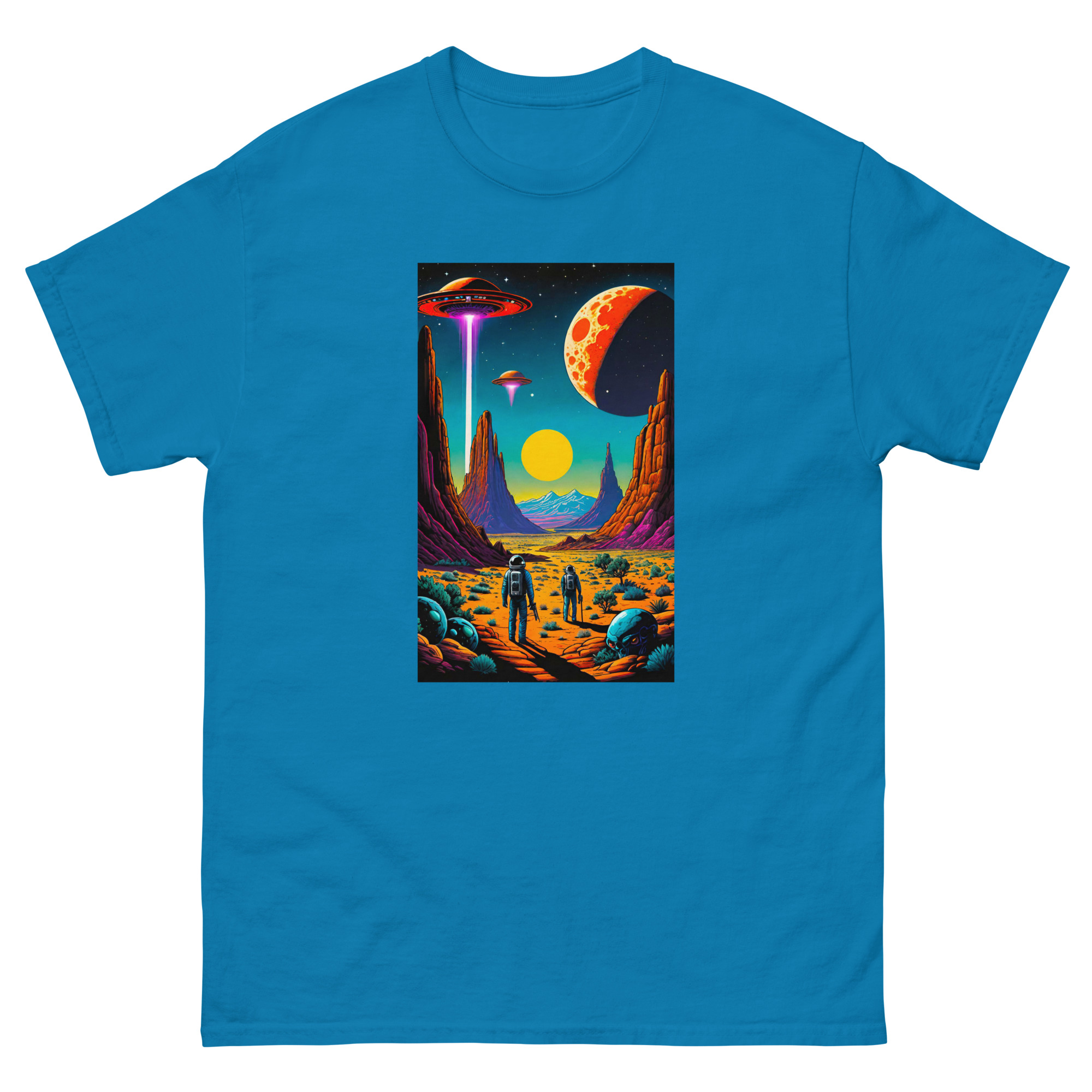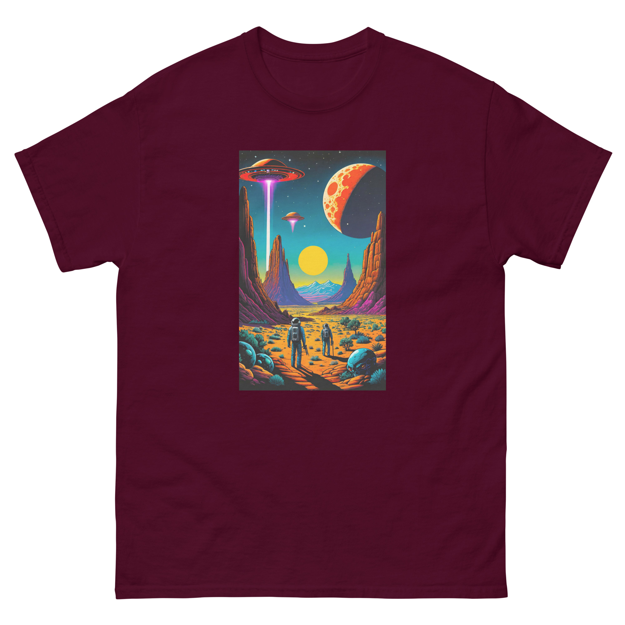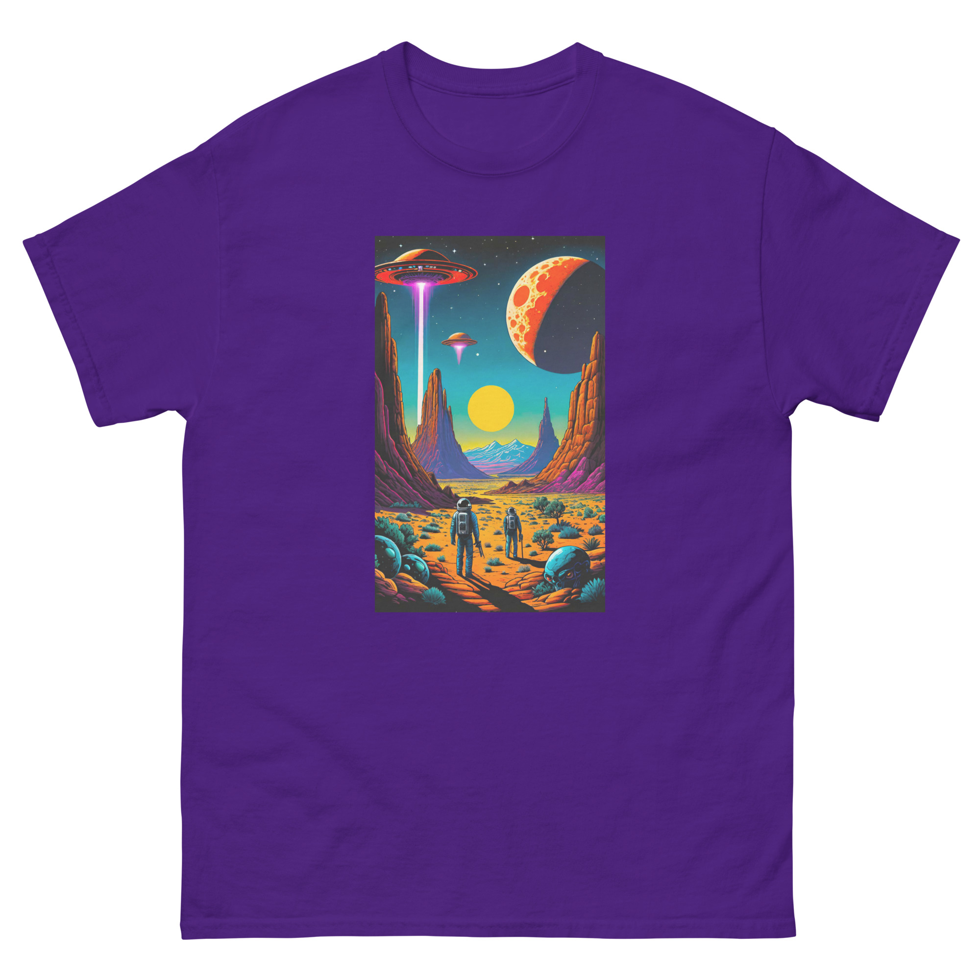 This 100% cotton T-shirt features a breathtaking full-color UFO graphic that merges the vast beauty of an alien desert with a thrilling sci-fi twist. Towering rock formations frame a surreal landscape under twin celestial bodies as UFOs hover with radiant beams lighting the scene. Two explorers in futuristic spacesuits stand at the edge of discovery while mysterious alien life peeks from the shadows.