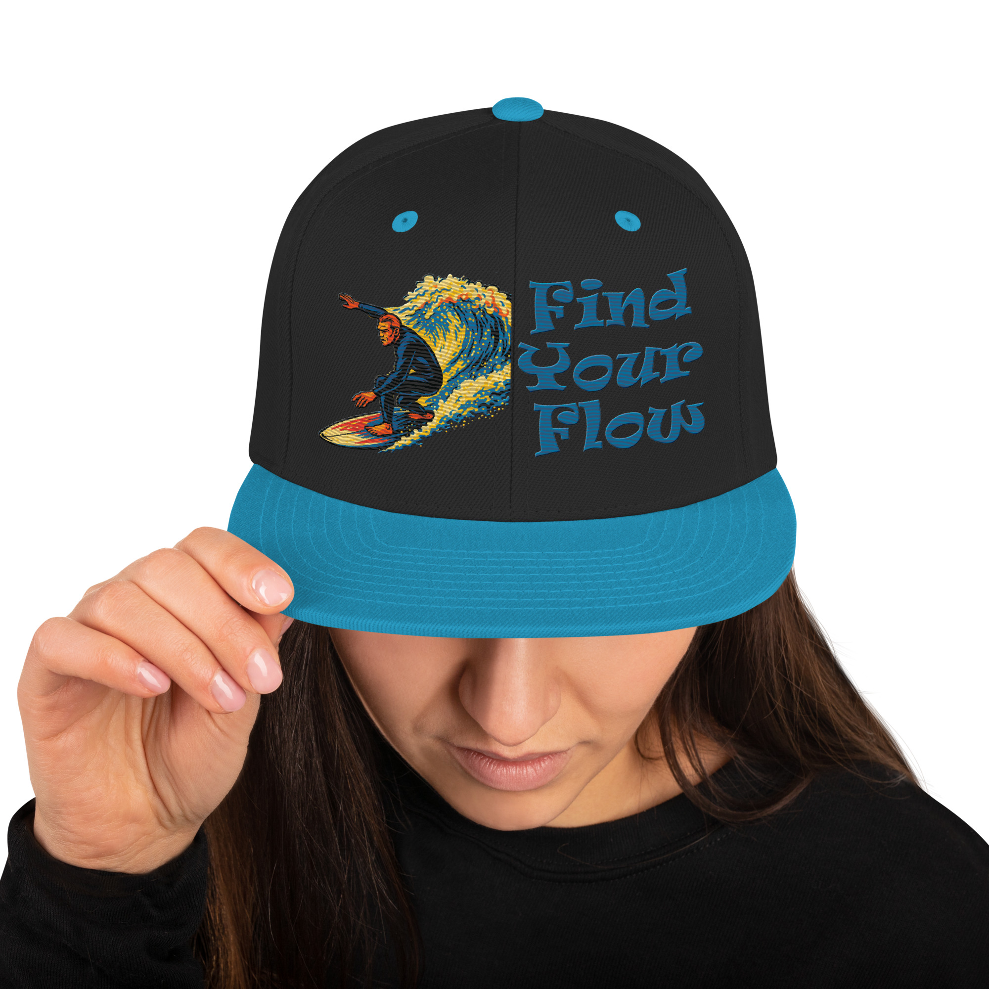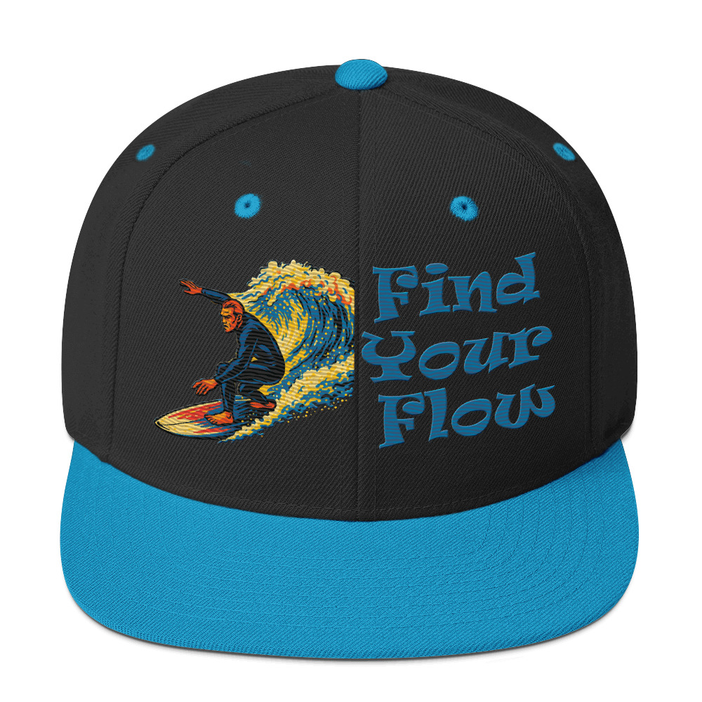 Tap into laid-back vibes and coastal cool with our Find Your Flow Snapback Hat. This bold two-tone design features a sleek black crown and a vibrant turquoise bill—like ocean and sky meeting at the horizon. Embroidered on the front is a surfer catching a perfect wave, with the words “Find Your Flow” riding alongside in ocean-blue thread.