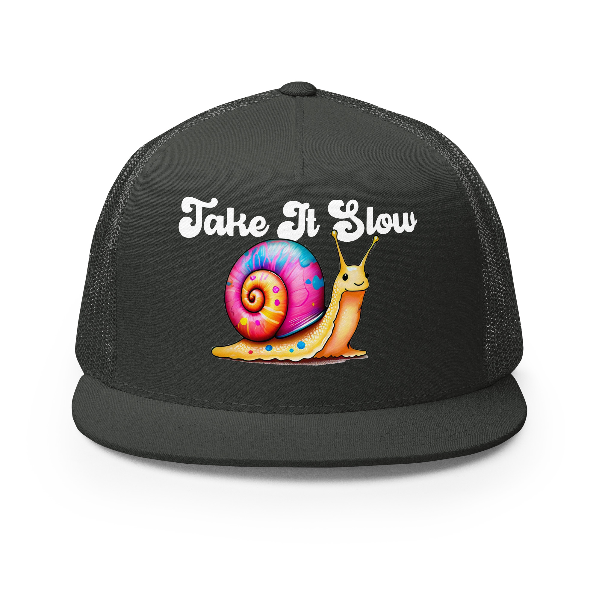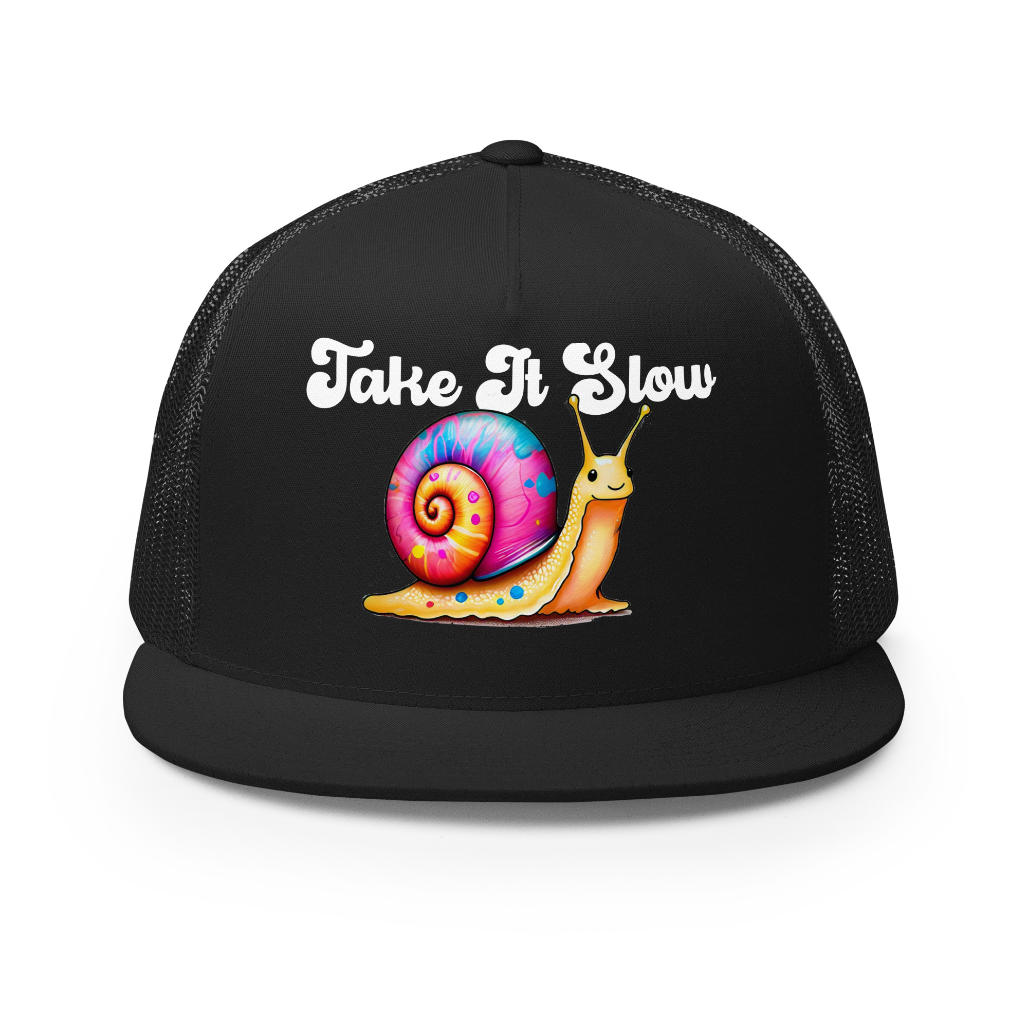 In a fast-paced world, this hat is your reminder to take a breath, unwind, and embrace life at your own pace. With its retro 60’s-style “Take It Slow” text and a charming snail sporting a rainbow-colored shell, this trucker hat encourages you to destress and savor the little moments. Designed with a comfortable fit and breathable mesh back, it’s perfect for those who value balance and relaxation in their day-to-day life.
